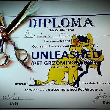 from Unleashed Pet Grooming School, in Oklahoma City, OK where proper grooming methods, skills & techniques were developed and acquired along with learning about various pet breeds, breed standards and pet handling safety during approximately 500 hrs. of hands-on training and instruction.